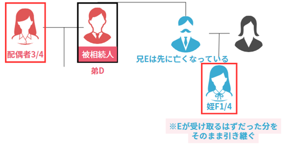【ケース】弟Dが亡くなったが、Dには子がなく、父母も先に亡くなっている。Dには兄Eがいたが、Eも先に亡くなっている。Eには子F(Dの姪)がいる。