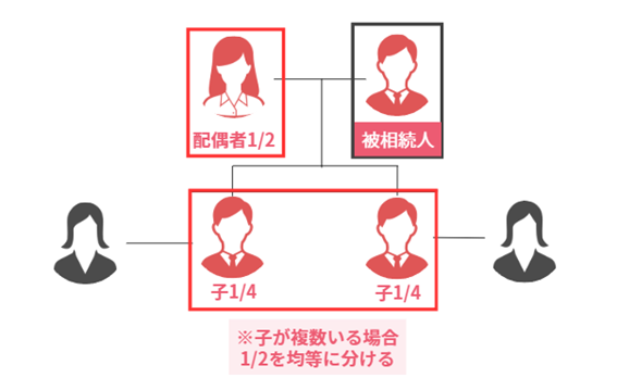 法定相続分:配偶者 1/2、子 1/2(子が複数いる場合は1/2を均等に分けます)