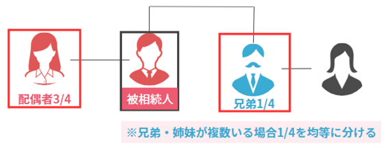 法定相続分:配偶者 3/4、兄弟姉妹 1/4(兄弟姉妹が複数いる場合は1/4を均等に分けます)
