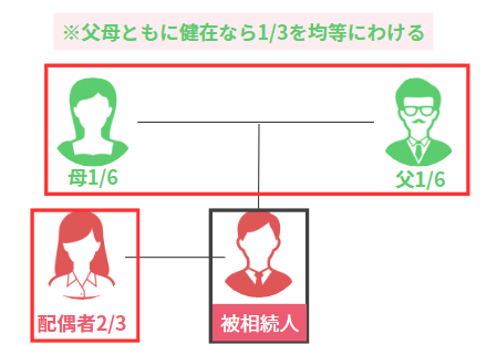 法定相続分:配偶者 2/3、親 1/3(父母ともに健在なら1/3を均等に分けます)