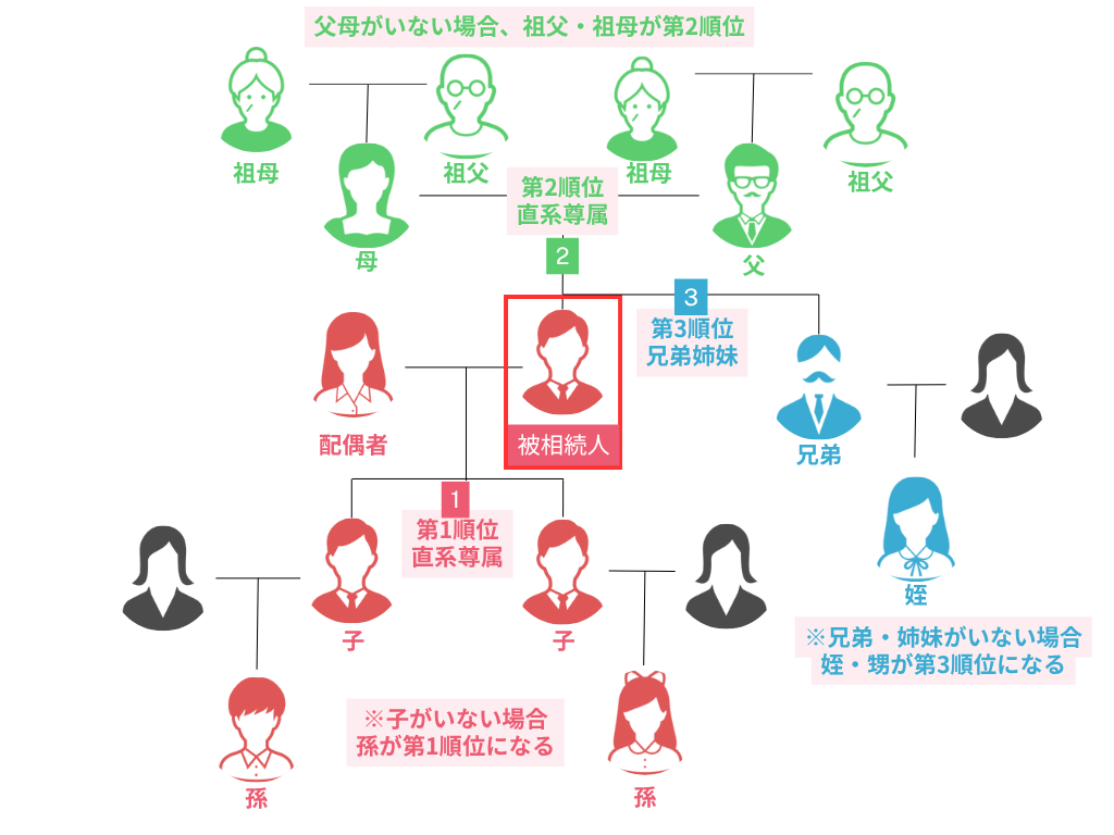 【血族相続人の順位】 配偶者以外の親族は、以下の順位で相続人になります。上位の順位の人が一人でもいる場合、下位の順位の人は相続人になれません。