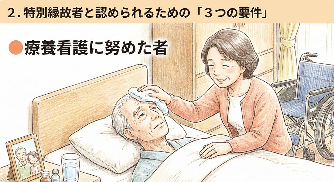 いわゆる「内縁の夫・妻」や、養子縁組はしていないけれど実の親子のように暮らしていた人などが該当します。 - 被相続人の療養看護に努めた者