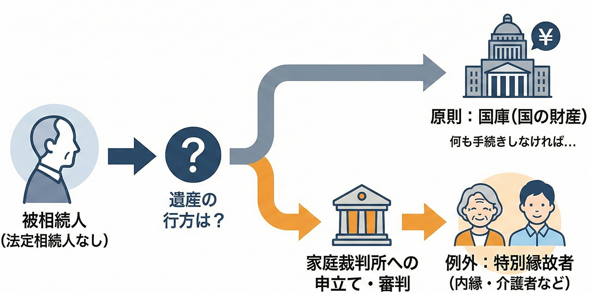 通常、亡くなった方に配偶者や子供、兄弟などの相続人が一人もいない場合、その遺産は最終的に「国庫(こっこ)」、つまり国のものになってしまいます。しかし、長年献身的に尽くした人がいるのに、すべて国に持っていかれるのは公平ではありません。