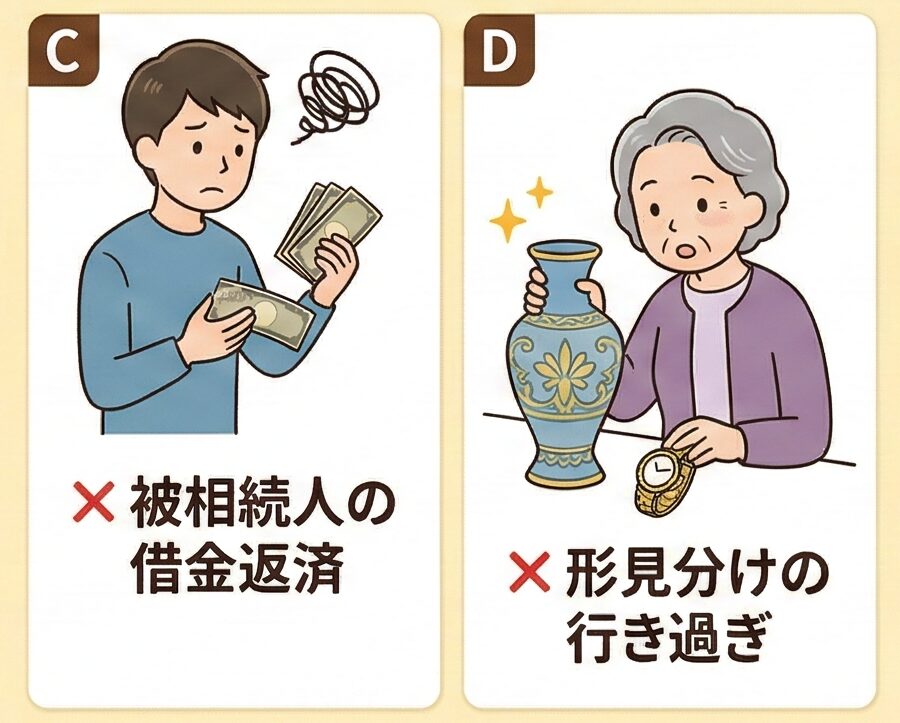被相続人(亡くなった方)の口座から預金を引き出し、生活費や葬儀費用以外の支出に使った場合(例:遺族の個人的な借金返済など)。