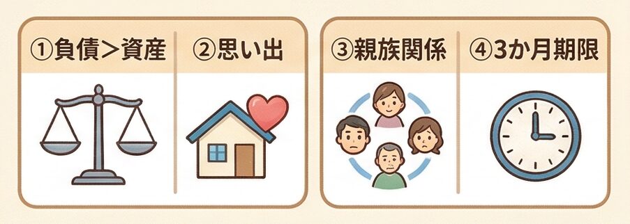 相続放棄をすべきかどうかは、以下の4つの視点で冷静に天秤にかける必要があります。